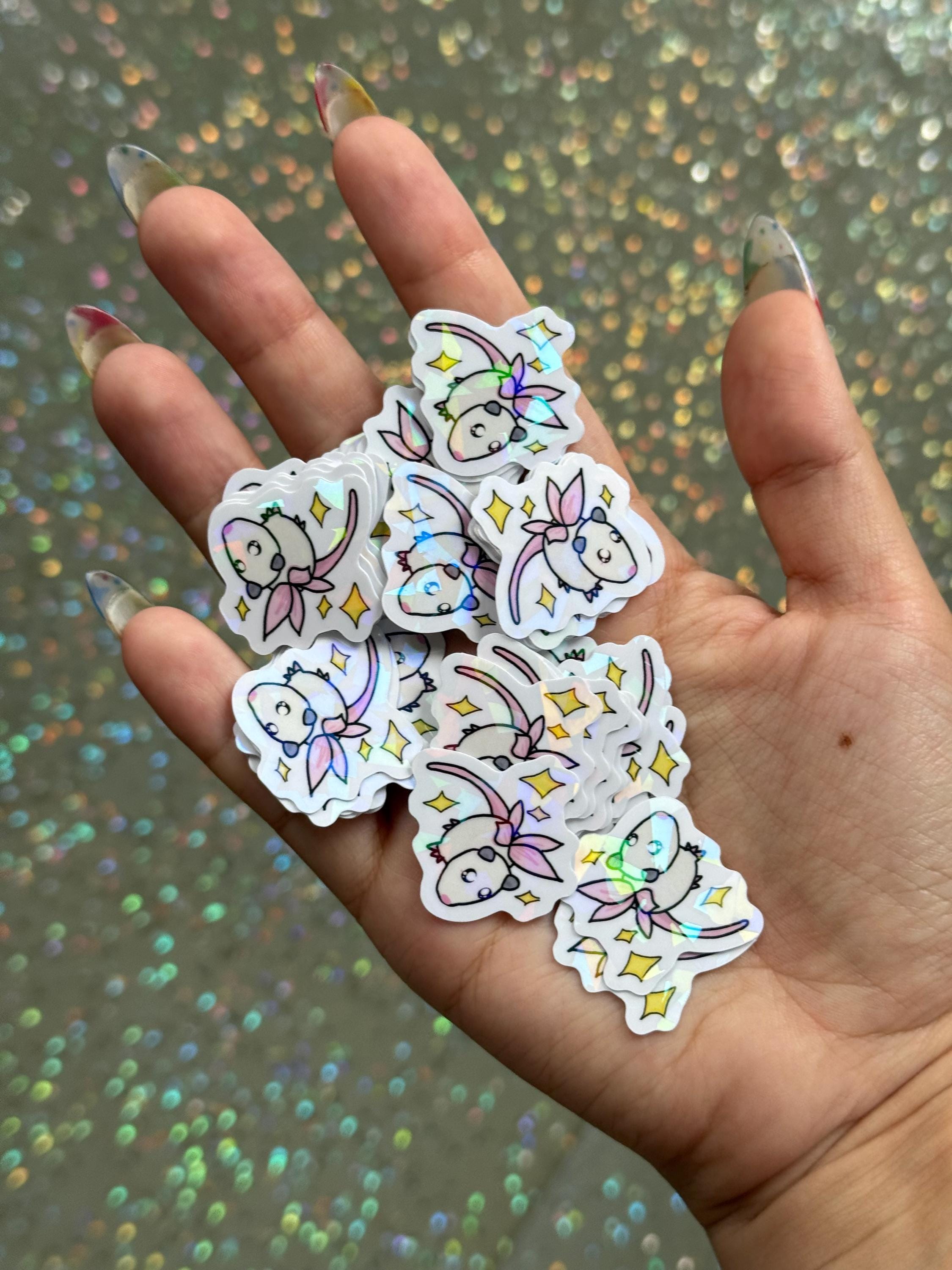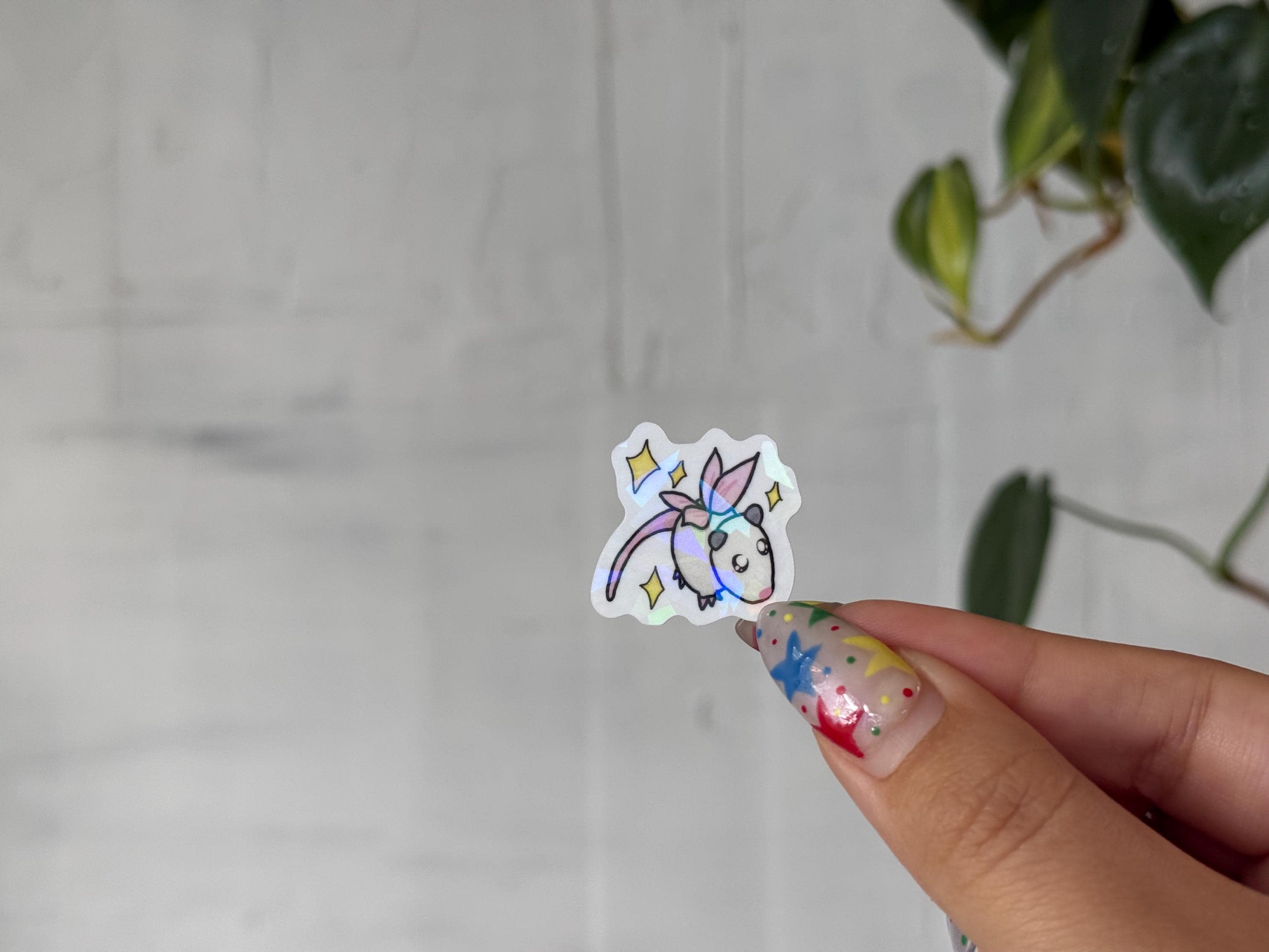 Sticker is vinyl with a shattered glass holographic finish, top row dishwasher safe, and super cute