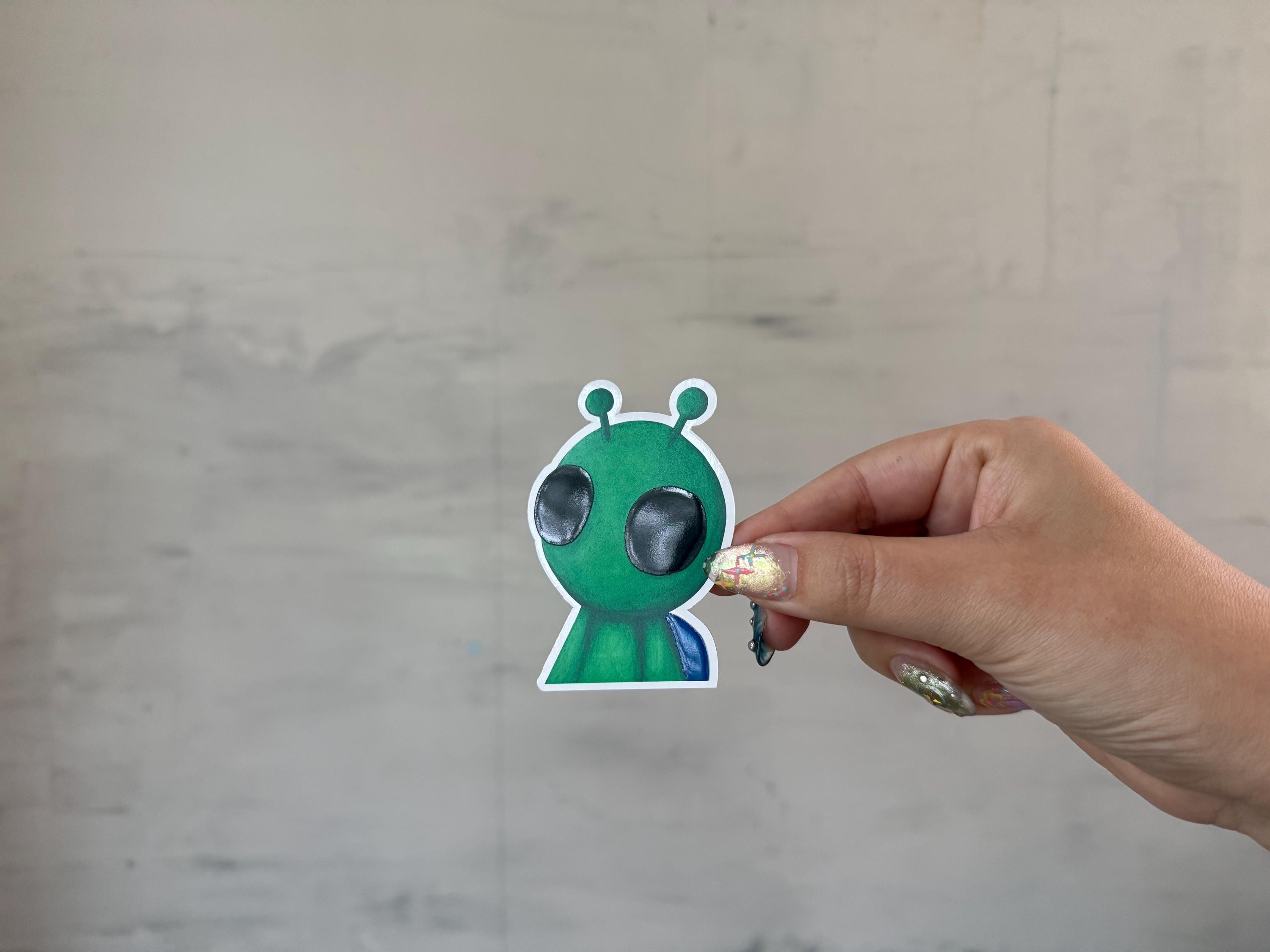 The sticker version of the oil pastel painting of the alien guy who was originally ceramic!